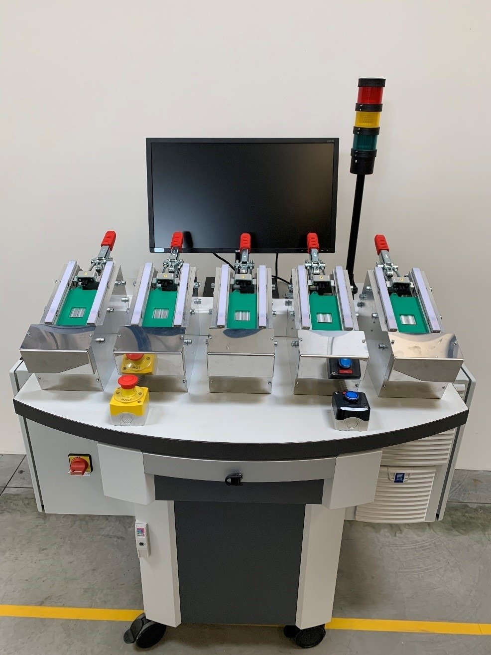 Testna naprava avtomatsko zazna, da je merjenec nameščen in od tu dalje poteka končna kontrola avtomatsko po programu. Začne s skeniranjem kode izdelka s serijsko številko do končnega shranjevanja izmerjenih rezultatov na trdi disk nadzornega računalnika. Za indikacijo delovanja, vmesnih posameznih faz in rezutatov ali napak je uporabjene RGB LED signalizacija z njihovo možnostjo kombiniranja barv za signalizacijo stanja samega testiranje. Za enostaven in natančen pregled poteka meritev in prikaza rezultatov same končne kontrole je nameščen na zadnji strani pulta večji LCD zaslon.