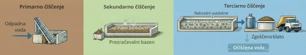 • Primarno (mehansko) čiščenje: Iz odpadne vode se izločijo grobe nečistoče, trdni delci, pesek in maščobe.
