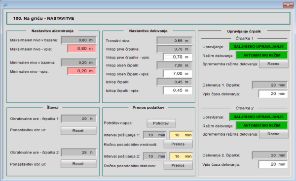 V sistemu ločimo med procesnimi podatki (dejansko stanje) in nastavitvenimi parametri (želene vrednosti). Operater vpiše nastavitve v nadzorni sistem, ki se prek GSM modula zapišejo v krmilnik.